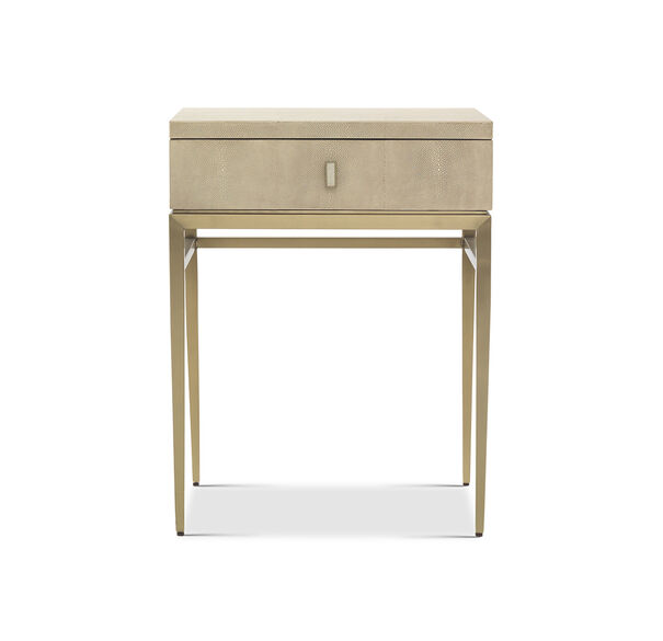 From our Solange Collection, this chic side table in faux shagreen echoes the glamour of Hollywood Regency in a modern way. The luxe finish is cast in resin from an impression of pebbled leather made from stingray skins. Applied in a repeating pattern, it achieves the classic texture with increased durability. This single-drawer side table is smartly sized for living and bedrooms. Featured here in a cream finish with a slim champagne-brass base/drawer pulls, also available in a warm gray finish with a slim brushed-pewter base/drawer pulls.