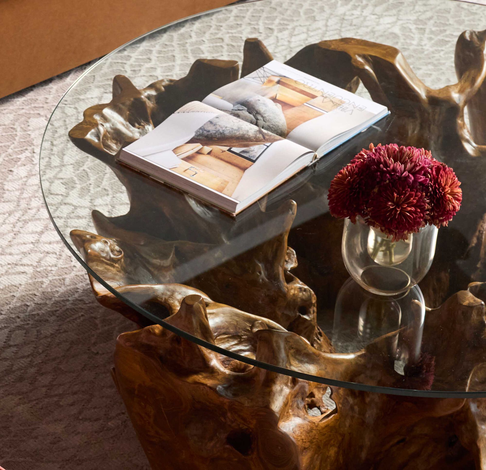 One-of-a-kind design: Let our natural teak root cocktail table, crafted from reclaimed teak wood, introduce an organic shape to your decor. We use it as an ideal counterpoint to clean modern scenes. Note the contrast of the bark's natural lighter color with the dark flat areas where the root was cut and smoothed. Each root is unique; color, size & shape vary. No trees were cut down to obtain the wood roots, which were reclaimed from trees sustainably harvested for lumber. The cocktail table comes with a 50" round tempered-glass top.