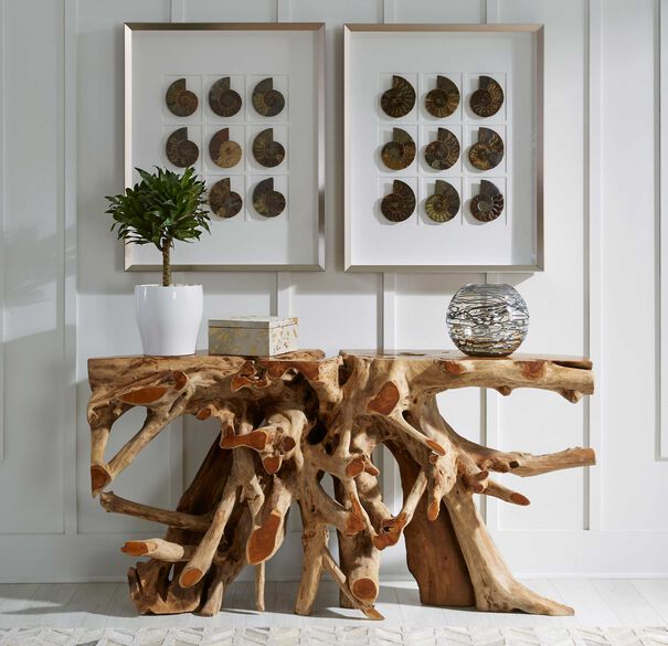 One-of-a-kind design: Let our natural teak root console, crafted from reclaimed teak wood, introduce an organic shape to your decor. We use it as an ideal counterpoint to clean modern scenes. Note the contrast of the bark's natural lighter color with the dark flat areas where the root was cut and smoothed. Each root is unique; color, size & shape vary. No trees were cut down to obtain the roots, which were reclaimed from trees sustainably harvested for lumber. The console comes without glass so that its full natural beauty can be appreciated; please note that although teak is naturally water resistant, we recommend coasters for drinks to preserve its beauty. Great statement in an entry. Or try two in a row behind a sofa for double the design power.